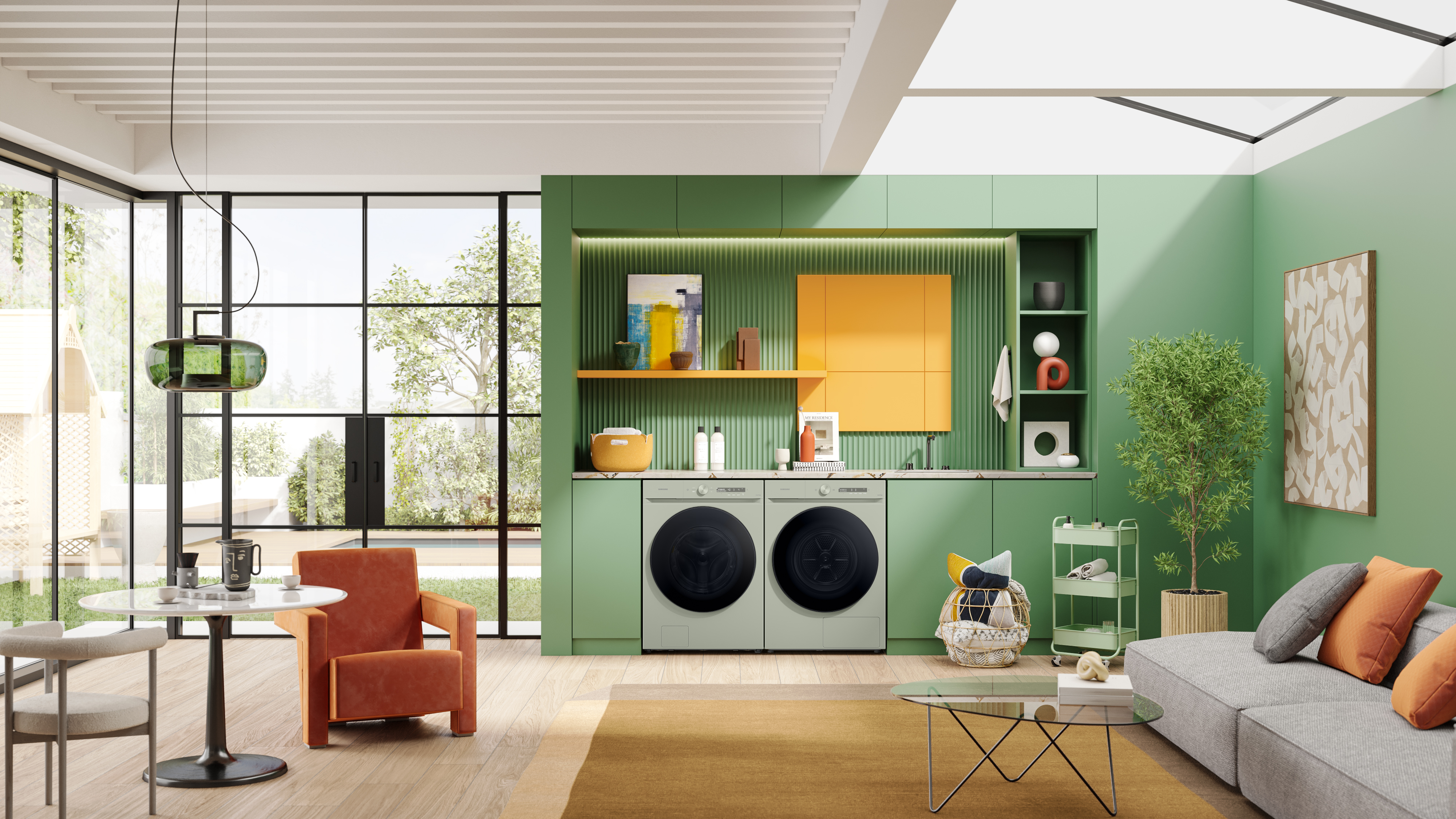 비스포크 그랑데 건조기 AI는 21, 20kg 용량으로 ‘새틴 세이지 그린’, ‘새틴 블랙’ 등 신규 색상을 비롯한 총 8종의 색상이 있다. 다이얼부터 전면 프레임까지 세탁기와 건조기를 하나의 색상으로 통일해 디자인을 더 고급스럽게 했다.